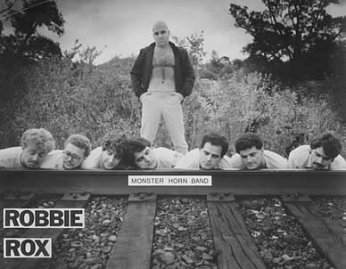Rox & The Horn Band on the day of their performance at the Lula Lounge, on Friday, the 10th of October 2003. Click here to see the full-sized image. Vito Rezza (drums), Lew Mele (bass guitar), Asher Horowitz (guitar), Rob Gusevs (keyboards), Robbie Rox (lead singer,composer,frontman), Perry White (tenor sax), Dave Dunlop (trumpet), Turner King (alto sax), Gord Myers (tombone) Live at the Silver Dollar, 14th November 2000